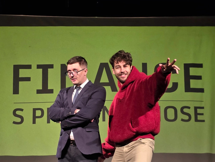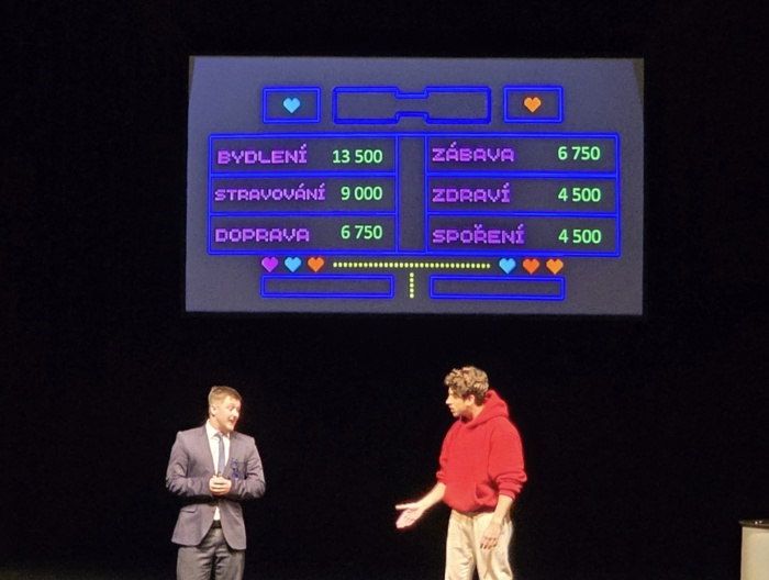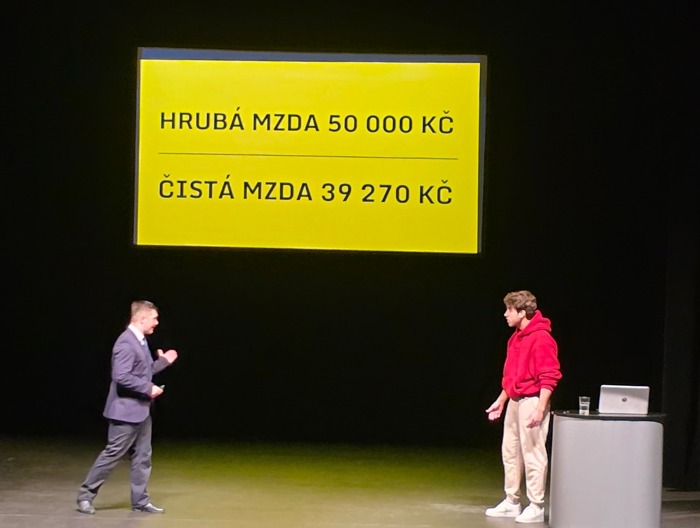 Komediálně̌ edukativní́ přednáška, která́ studentům pomůže získat základní finanční gramotnost. Dva herci v roli podnikatele a zaměstnance přibližují svět financí zábavnou, zapamatovatelnou formou a situační́ komedií. Objasňují pojmy jako je osobní rozpočet, krátkodobé́ a dlouhodobé́ finanční́ cíle, inflace, daně, dluhy, investice.