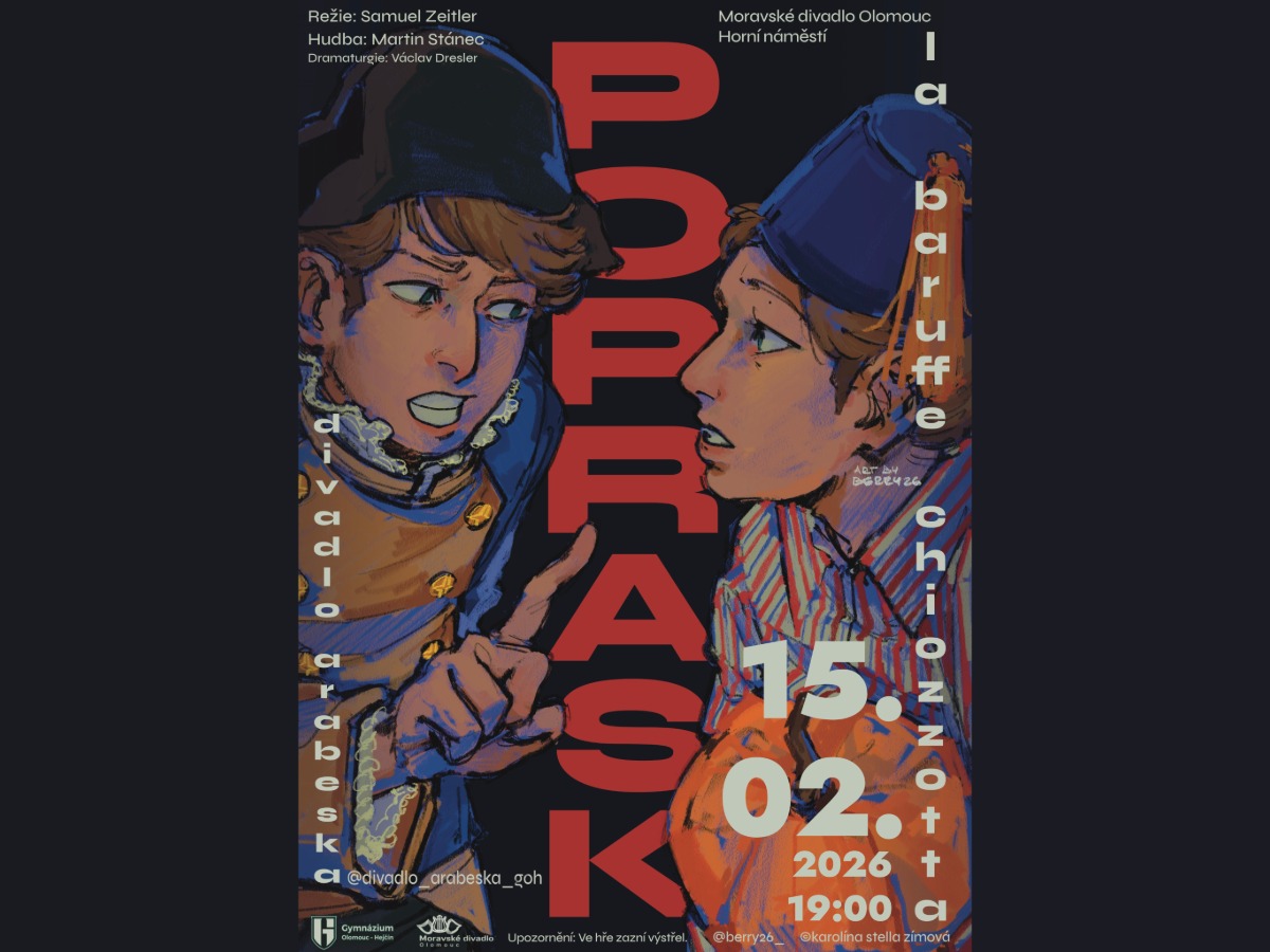 Při švarném kopu Apeninského poloostrova, skoro na samotném kolínku zablácené kozačky leží ještě zablácenější městečko Chiozza. Zapomenutějšího místa byste na světě nenašli, však marnivost, závist, mladičké dovádění a lidské touhy po svobodě a lásce uhnětou tento kus mořského dna do tvaru věhlasné mramorové sochy, ve které se leskne obraz každého z nás. Carlo Goldoni ve snaze vytvořit dokonalou hru přidává do obyčejného prostředí maloměsta svého jedinečného Golema, pročež se Goldoniho ideály nuzně degenerují. Jeho postavy hry, které spolu fanfaronsky koketují, nenávidí se, milují se a bojují se vším, co jim přijde pod ruku, skoro jako by Darwinova teorie sexuálního výběru promítala své zástupce i do lidských řad, vytvoří ideální prostředí pro jednu velkou tragédii. Divadelní soubor Arabeska při gymnáziu Hejčín nastudovalo lechtivou, pudy poháněnou inscenaci Poprask s podtitulem la baruffe chiozzotta (rvačka v Chiozze) na motivy klasicistní komedie Carla Goldoniho Poprask na laguně. Zpracování skrz režijní klíč bylo výrazně příběhově, konfliktem a čiřejším vypracováním postav upraveno, takže se můžete těšit na něco dočista nového, páchnoucí zdravou vůní absurdní ryby. Málokterá komedie končí rozporuplně tragicky, však ta naše sází na optimismus, kterým si každý z nás může vyjádřit nejintimnější chtíče hluboko ležící v našem nitru. Celou inscenaci bude navíc doprovázet geniální orchestr pana Mgr. Martina Stánce s autorskou partiturou.
